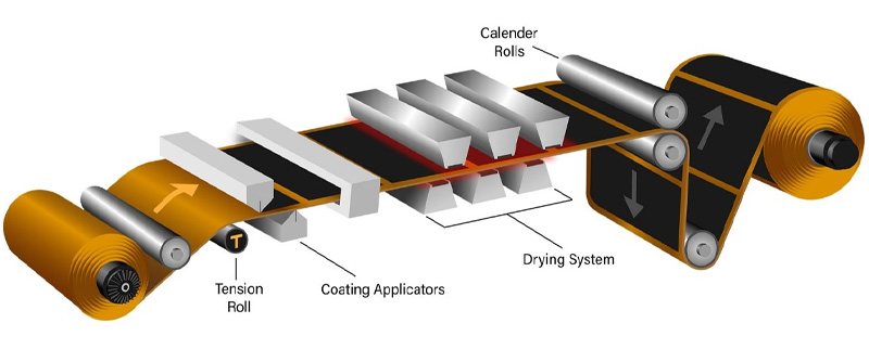 在电池电极制造中可以采用各种工艺,包括涂层、干燥、压延、检查和分切。在电池结构中,电极由涂有专有化学混合物的箔基板组成。正极(阳极)使用铝箔,而负极(阴极)使用铜箔。涂层过程中所用材料的成分会影响电池的性
