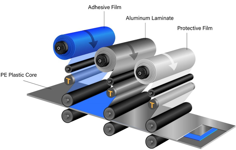 在三层复合材料的制造中,可以采用各种工艺,包括聚合物挤出,蜂窝成型, 粘合剂涂层和层压。精确的张力控制对于确保粘合剂、表皮和芯材成功结合在一起并保持均匀性非常重要。